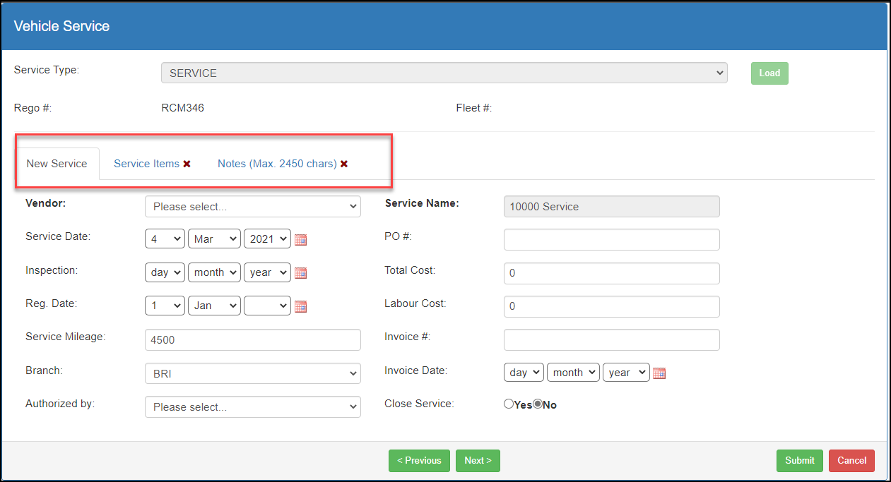 There are 3 tabs on the Vehicle service screen that allow entry of Information.