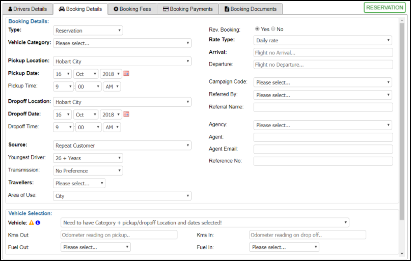 The Booking Details screen is where details regarding the reservation are entered, this includes details like reservation type, vehicle, pickup/ drop-off locations and times.