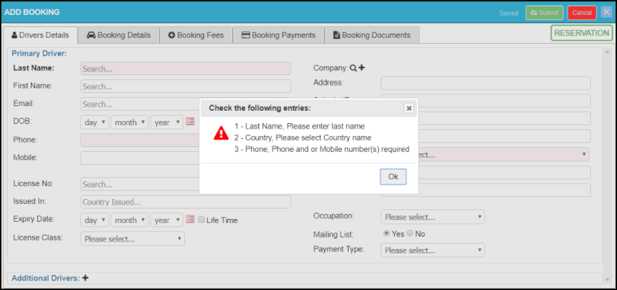 You can navigate to any of these pages at any time in the booking process so long as the mandatory fields on previous pages have been completed. For example, if you attempt to open the Booking Payments page without filling in the necessary driver details an error window will be displayed with the fields that need to be filled.