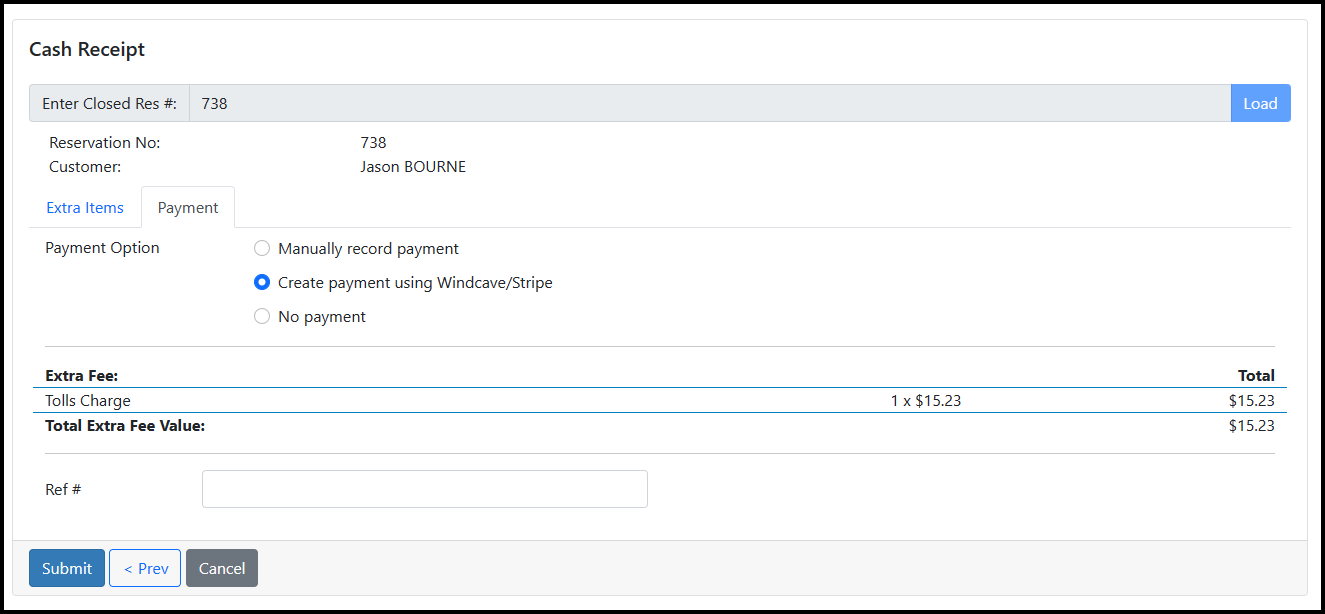 If you have a Payment Gateway set up in your system, RCM now allows you to take a payment through it when you create a Cash Receipt. This allows for the immediate addition and charge of an extra fee to a booking that is already closed. This feature is useful for adding traffic infringement or damage charges to a booking after it has been returned.