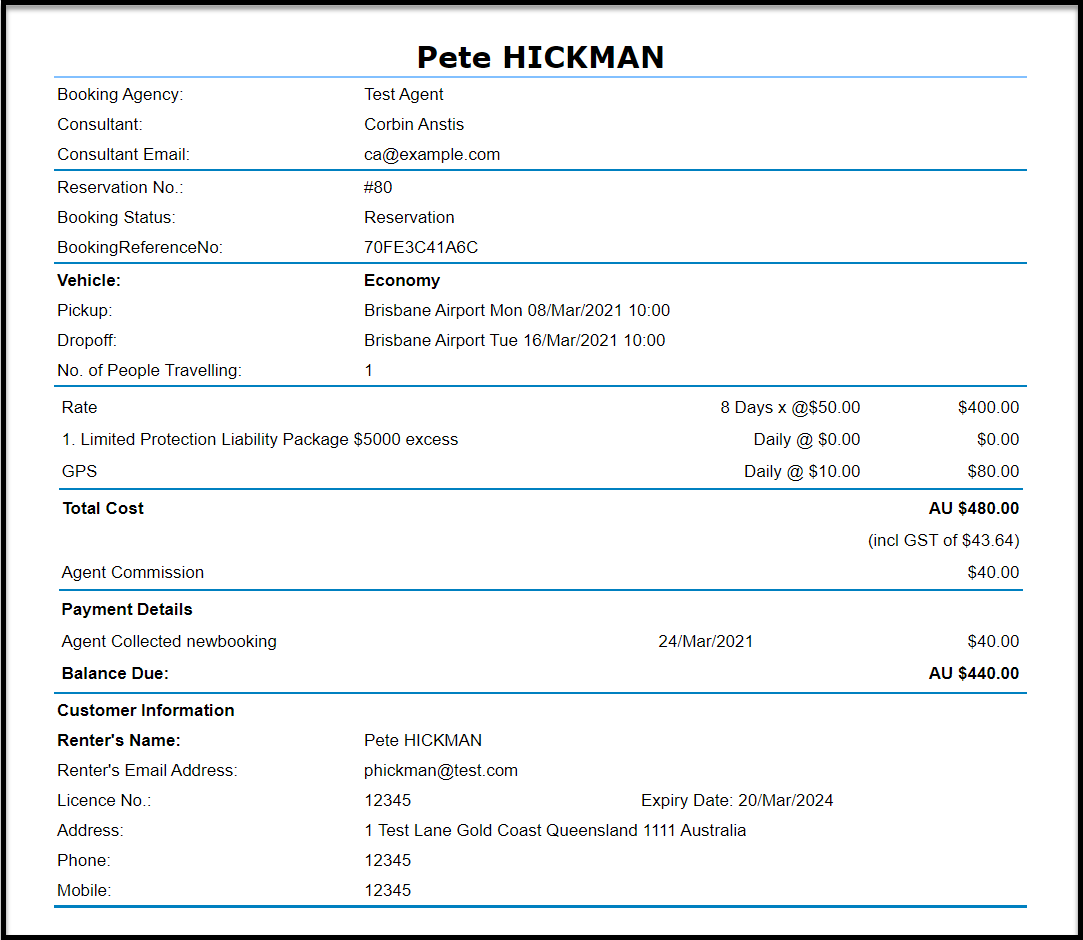 If the Agent wishes to view/print the booking details/confirmation, click on the res number in red as seen above. The booking details/confirmation will then displayed in a separate window.