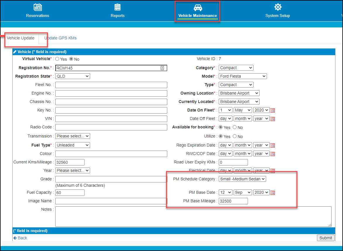 As we have never created a service for the vehicle in RCM previously, we need to tell RCM when the last service was performed on the vehicle so we can calculate the next. To achieve this, you need to enter a value into the PM Base date and the PM base kms field.