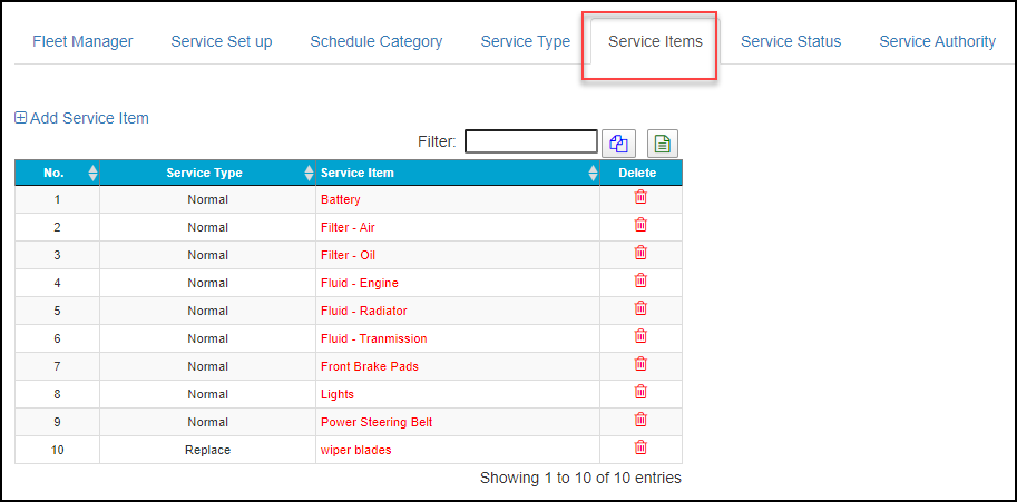 From the Fleet Manager screen, click on the "Service Item" Tab