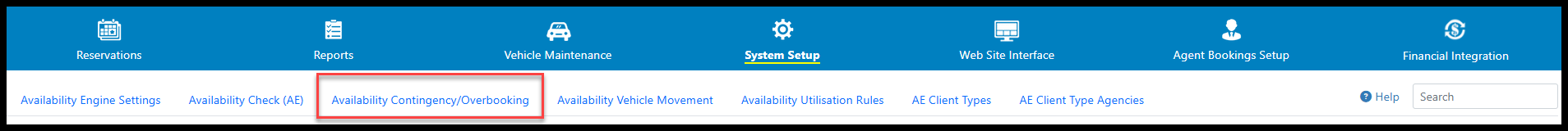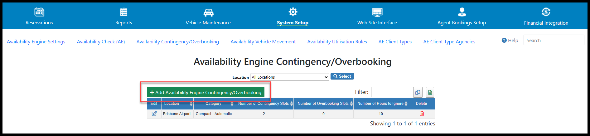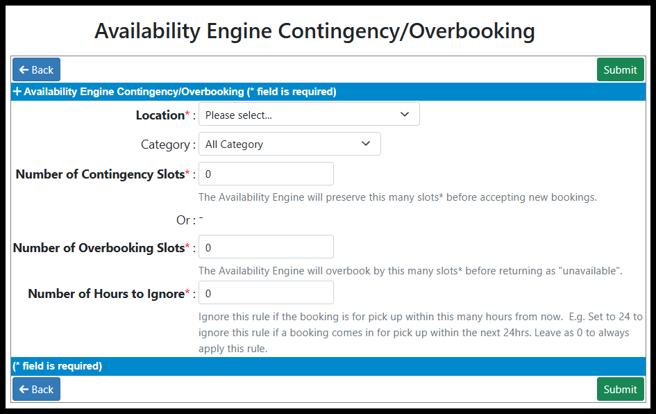 By default, the Availability Engine (AE) will search for any available gaps on any vehicle for a particular request, and if it finds one it will return the "available" status. However, Contingency and Overbooking slots allow you to modify how this search for available vehicles works. It allows you to hold back some contingency slots in reserve (e.g. for unforeseen maintenance/late returns), or to overbook a category by a certain number (e.g. if you anticipate some cancellations, or if you know you can move these bookings to another category).