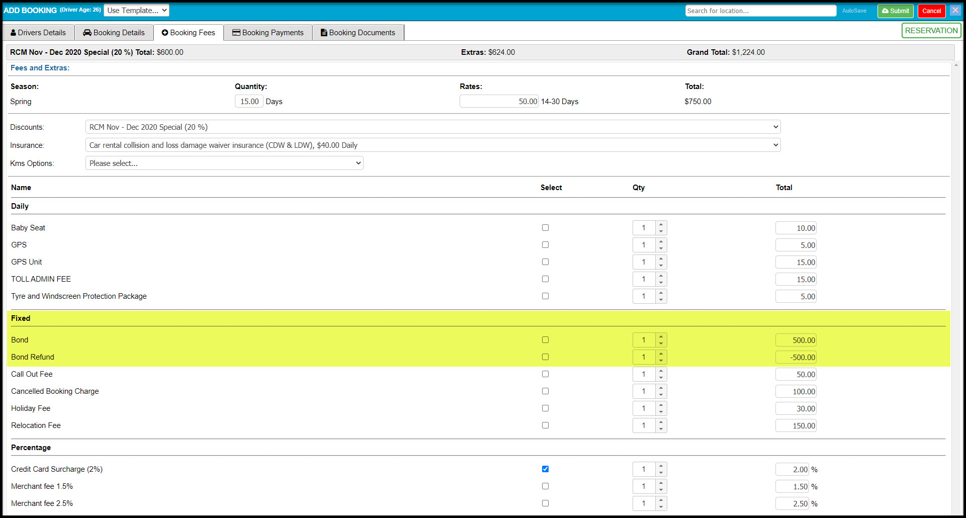 Rental Car Manager handles the bond amounts held by offering a "Bond" extra fee type. This requires you to create an extra fee for both the Bond and the Bond Refund.