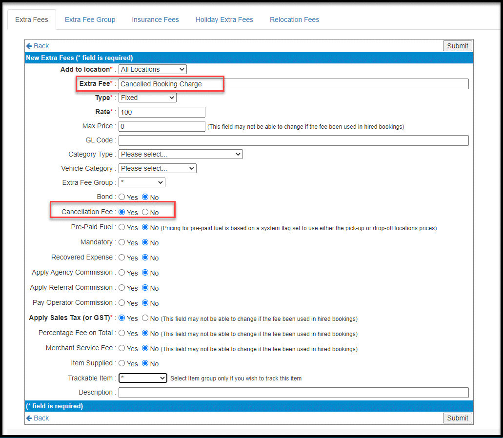 The screen shot below shows the Cancellation Extra Fees screen for a fee called "Cancelled Booking Charge" and highlights the flag setting required.
