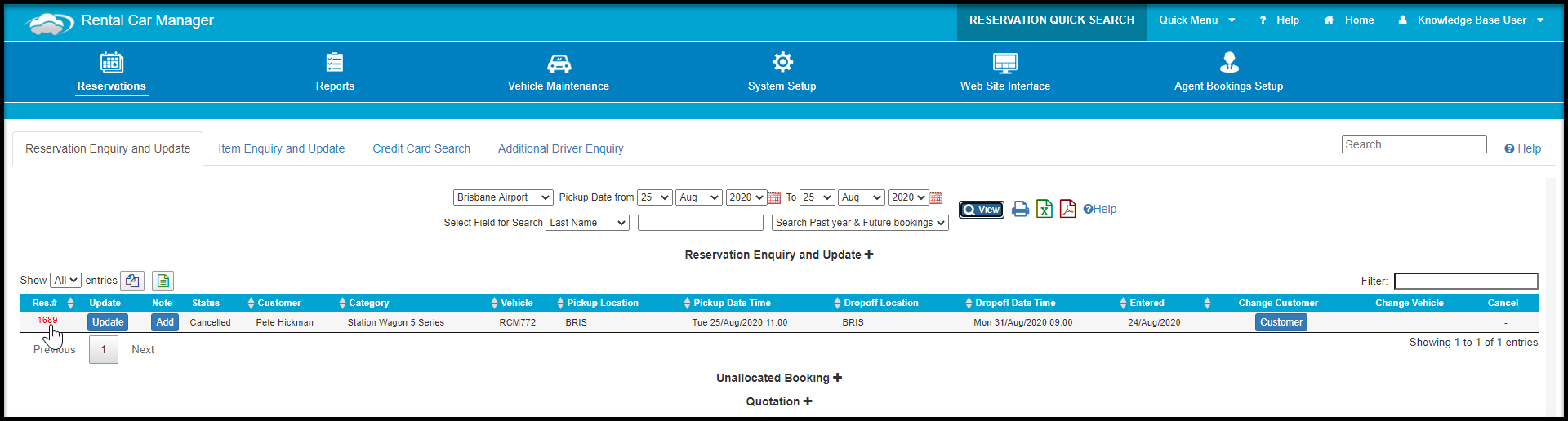 Under certain circumstances if you wish to revive the booking that has already been cancelled, you are able to do so just by selecting the Reservation type as 'Reservation'/'Hired'/'Returned' as per your need. Note that a cancelled booking cannot be un-cancelled in following situations: