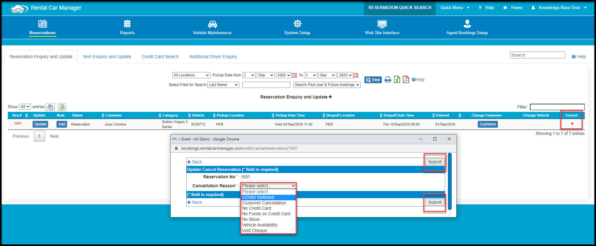 - Select your cancellation reason on the drop down to "Covid Deferred" that you created earlier as shown in this article above.