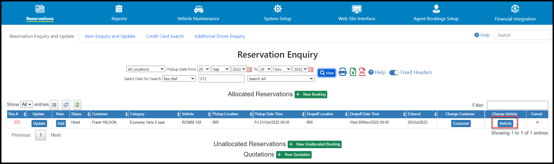 - Find the booking to change the vehicle for on the Reservation Enquiry and Update screen, press "Vehicle."