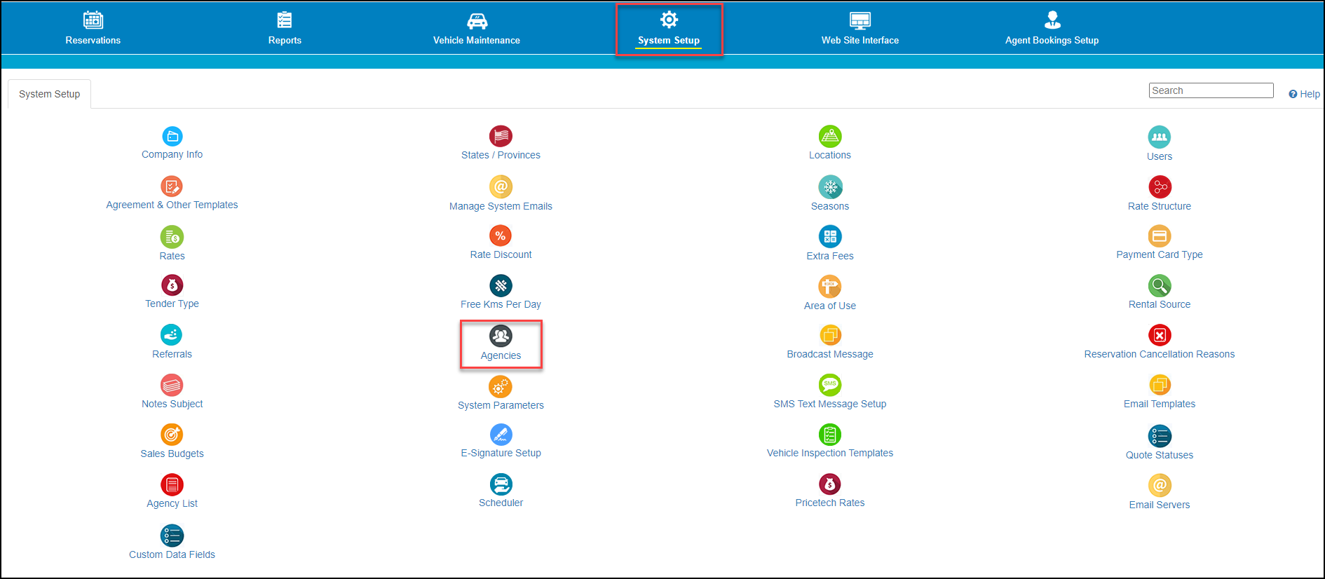 To find the Agency Name and the Branch Code, from the System Setup menu , click on the 'Agencies' icon.