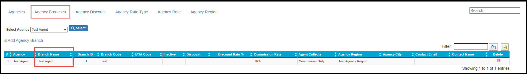 The Agency Name will appear in the list as shown below. To find the Branch Name, click on the 'Branches' button for the Agent