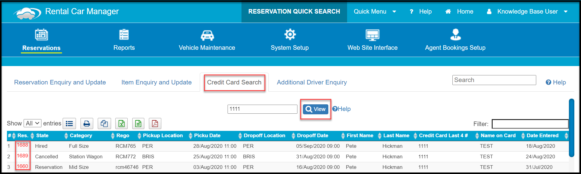 Reservations with a matching credit card number will then be displayed.