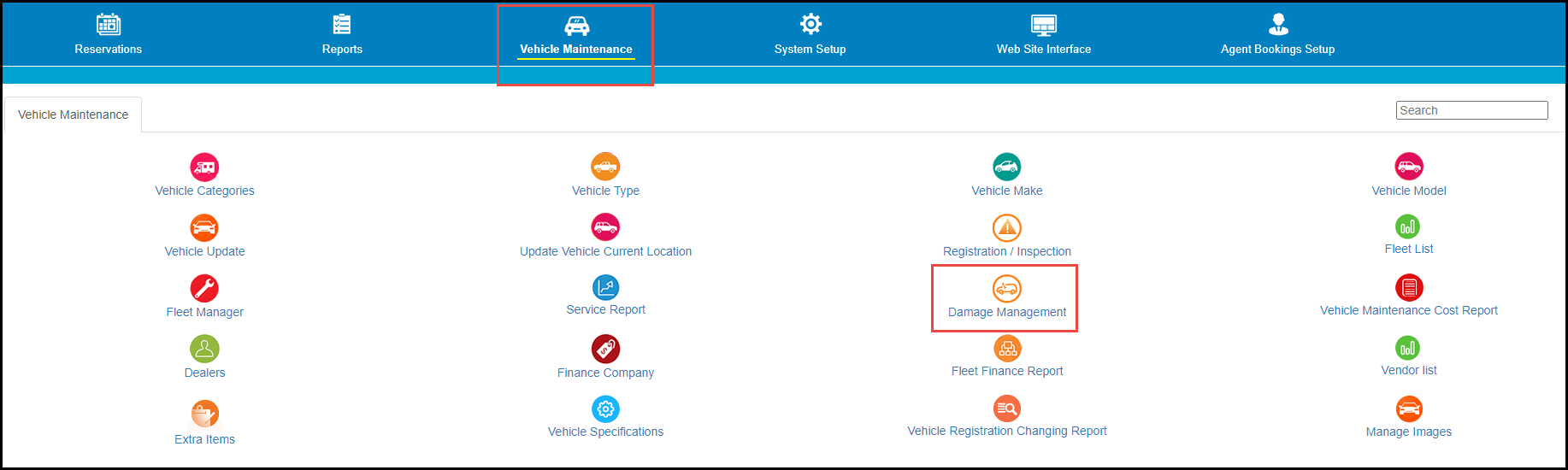 You can add a new damage record on the Damage Management page, accessed by Vehicle Maintenance >> Damage Management. On this page, you can search for a vehicle by its Registration or Fleet Number and add a damage against it. Alternatively, you can search for the Reservation Number of a hired or returned booking and add a damage to the vehicle this booking is against.