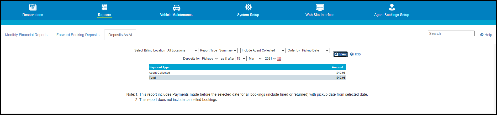 | Date | This is the date the report will use as the point in time for the report. It will only return bookings which have either a pickup or a drop off date on or after this date where the payment was recorded before this date. |