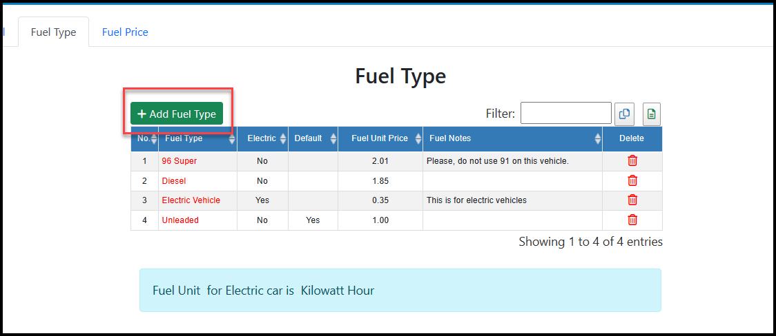 Fuel types refer to the different types of fuel used by the vehicles in your fleet. For each fuel type added you can specify the price per unit (litre or gallon) and also whether it should be the default fuel type used when adding a new vehicle to your fleet. You can also create fuel types for electric engines that behave slightly differently.