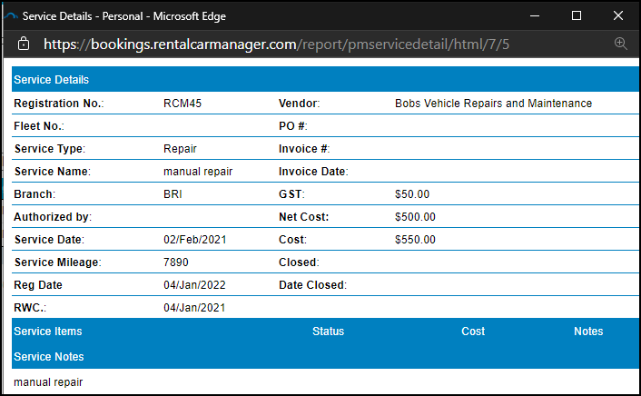 You can also access Vehicle Maintenance>Fleet Manager to search for and list all services for a vehicle