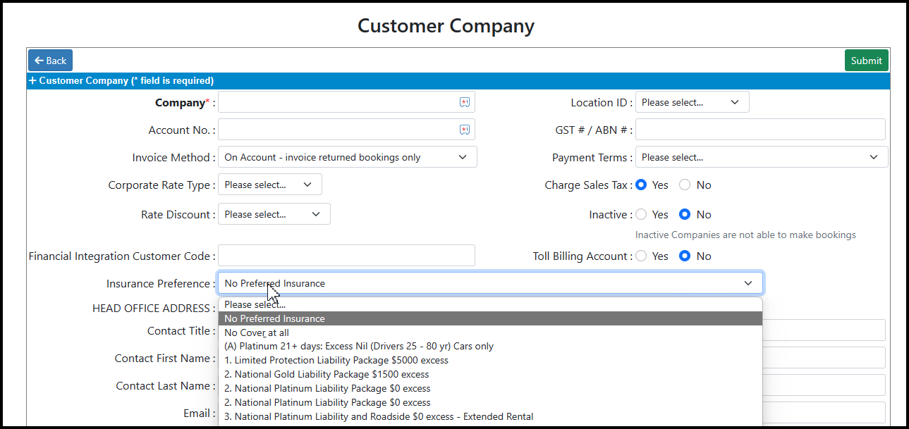 RCM now allows you to set a Preferred Insurance against Customer Companies. This means that any bookings made against this Company will automatically select and use this insurance option.