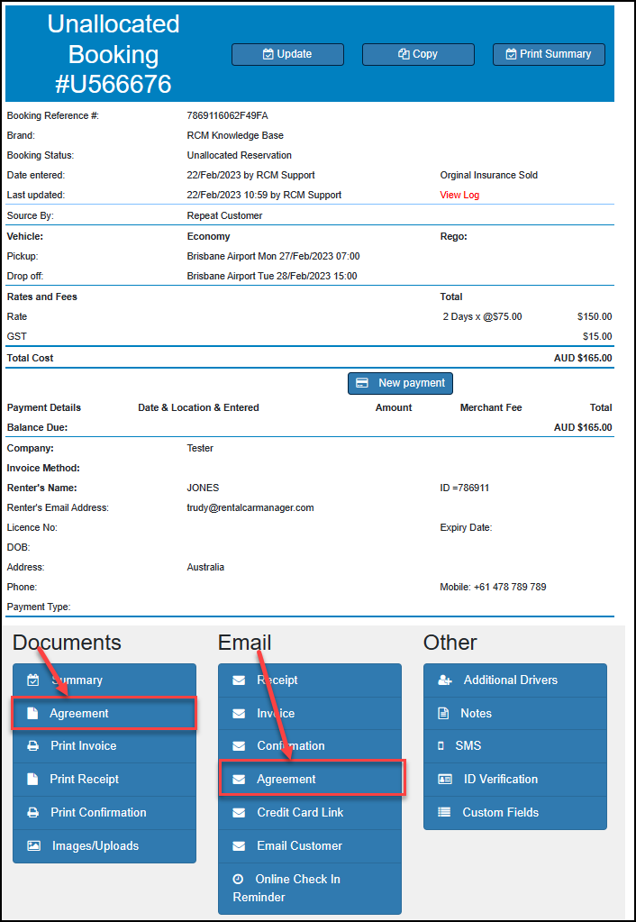 Once the flag is set, the option to Print and Email Agreements from an Unallocated booking will appear in the Document and Email sections of the Booking Summary.