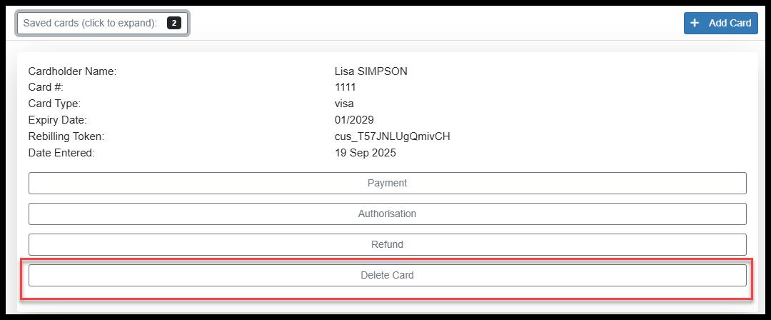 Please note: If there are payments or authorisations already saved against a card that is then deleted, these transactions can still be voided, captured or refunded.