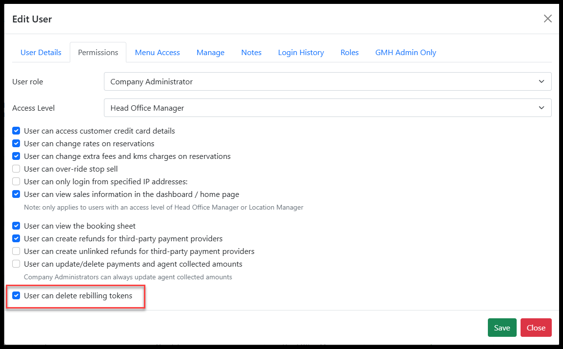 When updating a user's information, on the Permission tab there is an option called "User can delete rebilling tokens". If this is selected, as shown below, then the user will be able to delete cards saved in any payment gateway.