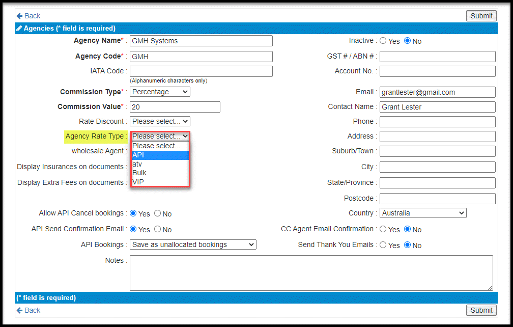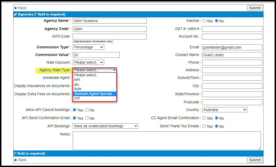 - On the Agency Rate Type field, select from the dropdown list, the Rate Type for this Agent.