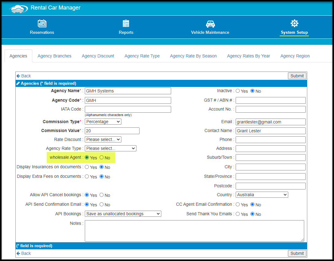4. Set the 'Wholesale Agent flag' to 'Yes'. Click Submit to save changes.