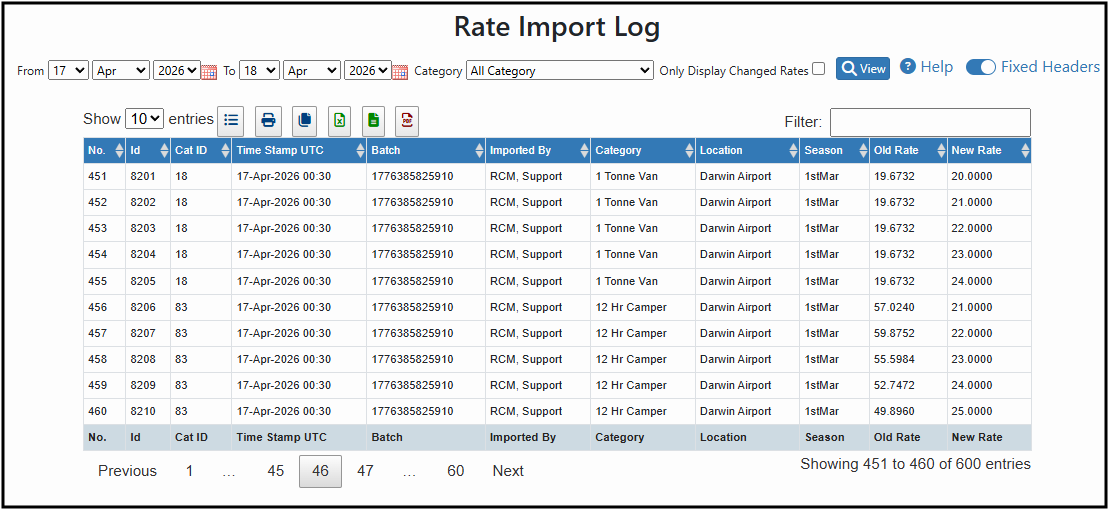 Only Display Changed Rates | Checkbox to specify if you only want to see the logs for rate changes, to make it easier to find the rate change record you want to audit. |