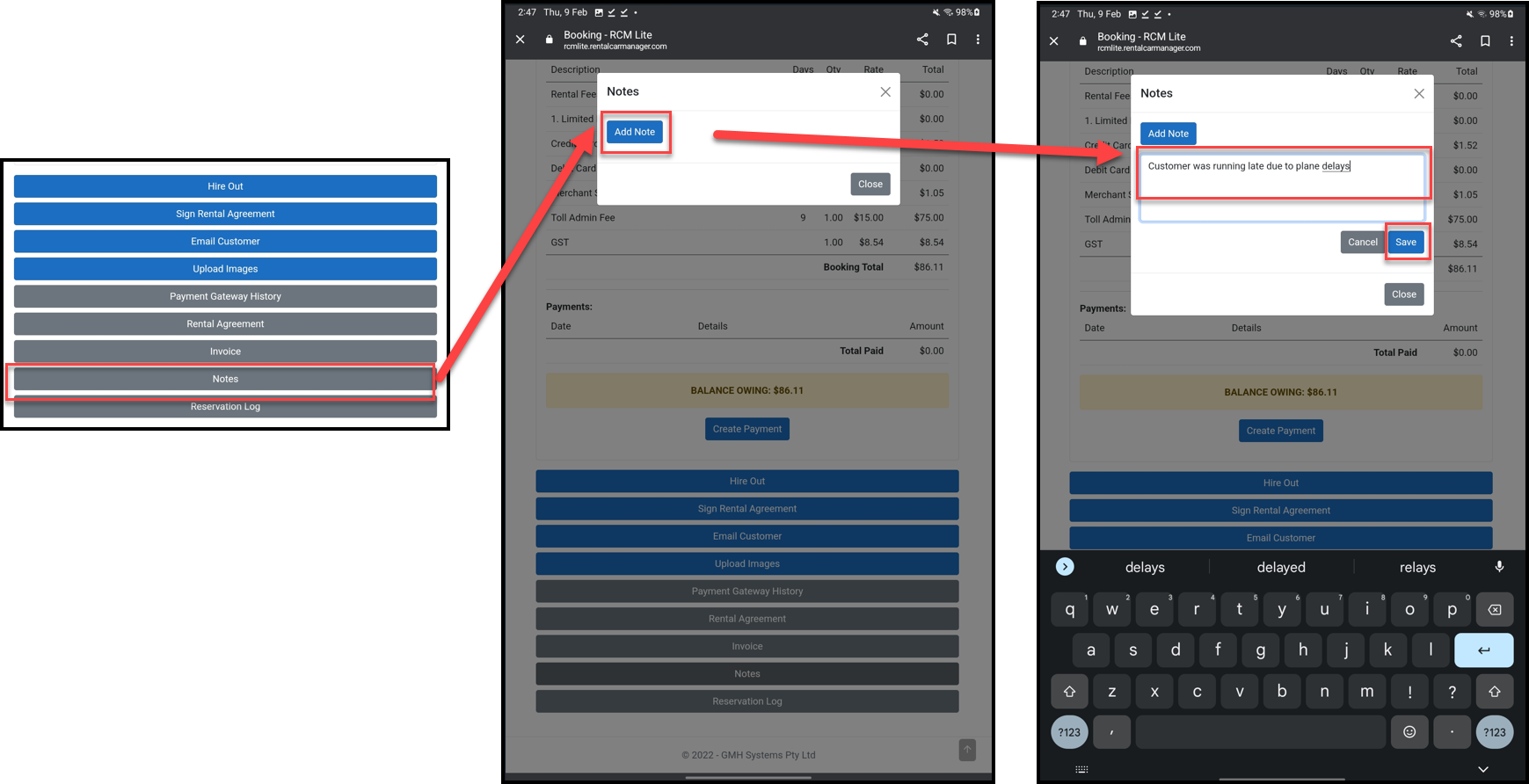 The "Notes" button allows you to add notes against the booking. Selecting this button will open up the Notes window, and you can select "Add Note" to add a new note against the booking. Once you have entered the note, press "Save".