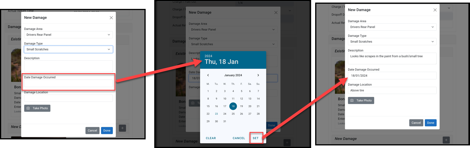 To set the "Date Damage Occurred", will need to click the box to open the calender, select a day and press "Set". Please note: this day must be during the hire of this booking, if it is outside the bookings date range, the damage will not save.