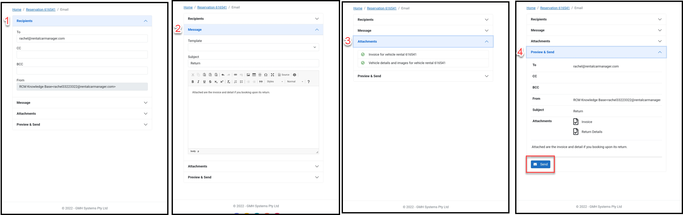 After the workflow has been completed and the vehicle has been returned, if "Email Hirer?" is ticked, you will be taken to the Email page shown below. The 4 sections of this Email page are: