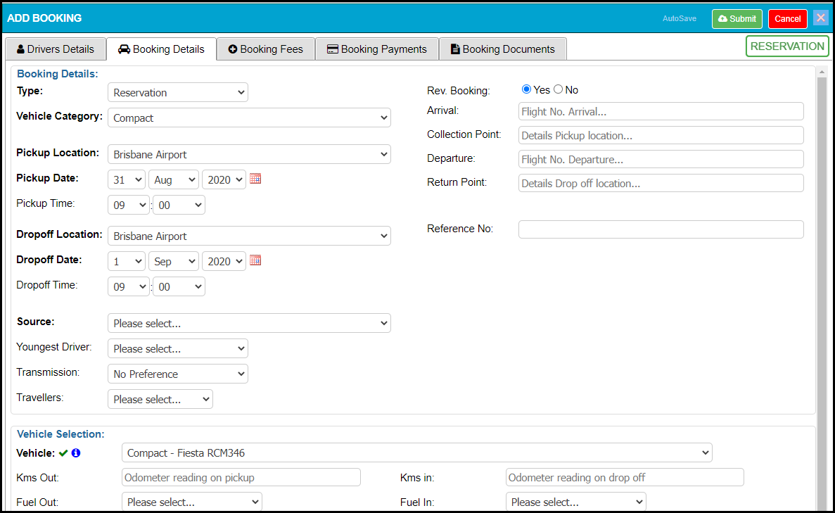 If you wish to create a new booking for the vehicle in question, simply click on the Book button. The Booking form will be displayed, as shown below. the vehicle information will be pre-filled with the relevant information. You can see below, that the Booking Form will open on the Booking Details tab.