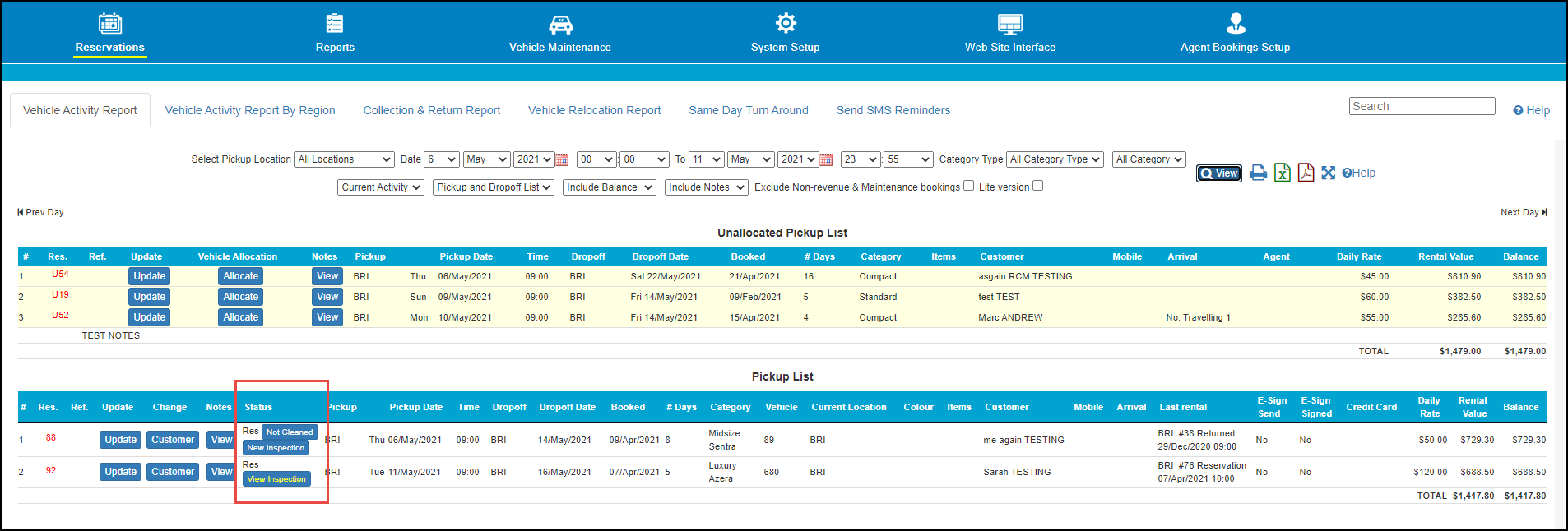 To create an inspection for a vehicle through the Vehicle Activity Report first navigate to Reports >> Daily Activity Reports >> Vehicle Activity Report. Once you are on the Vehicle Activity Report page, you can filter the bookings and their vehicles according to pickup location, date range and category.