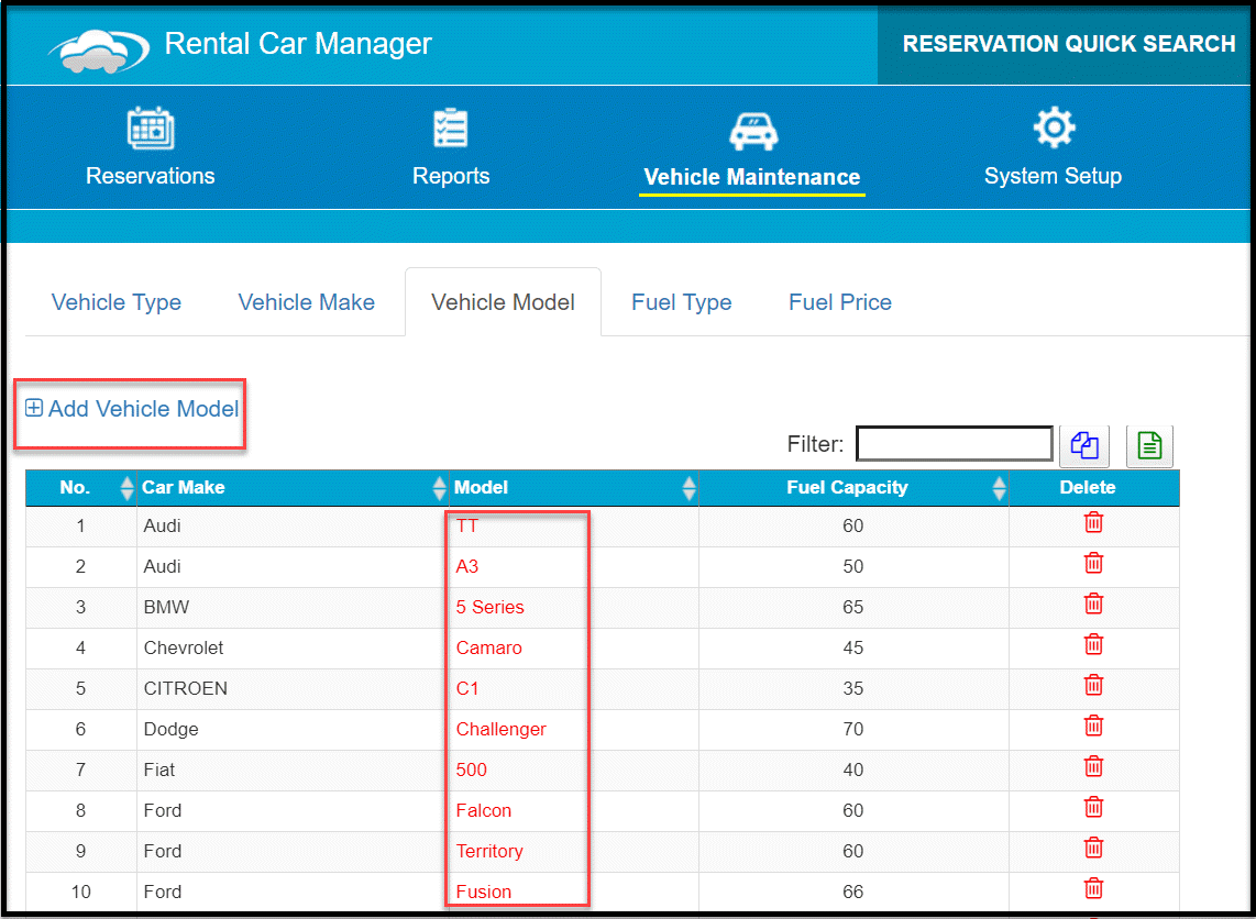 The Vehicle Model tab can be found under the Vehicle Maintenance menu.