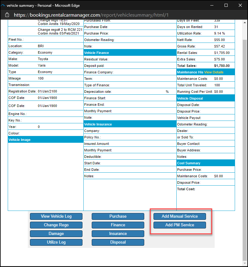You are also able to add a PM Service to a vehicle via the Add PM Service and Add Manual Service buttons at the bottom of the individual vehicle summary screen