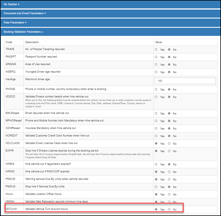 To turn this functionality on, you need to update the System Parameter: “Validate Vehicle Turn Around Hours” so that is it set to “Yes” as below.