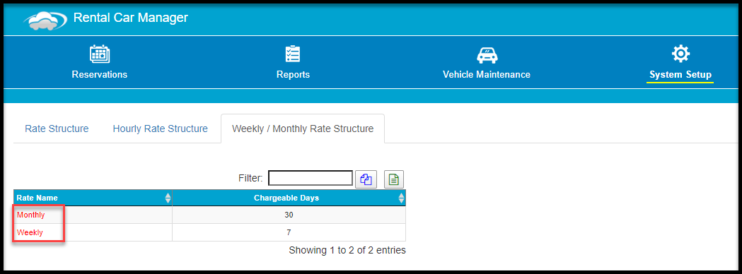 Accessing the Weekly / Monthly Rate Structure tab
