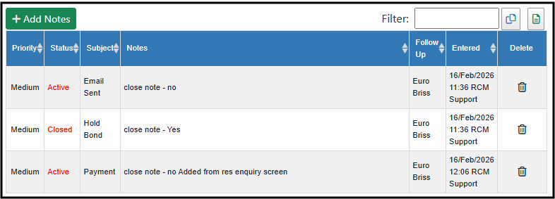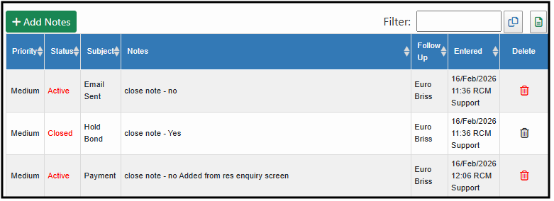 If you have the permissions to edit or delete a note, the delete icon will appear in red.